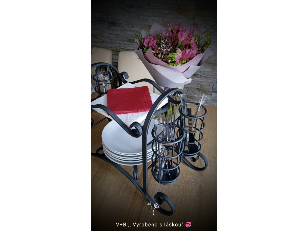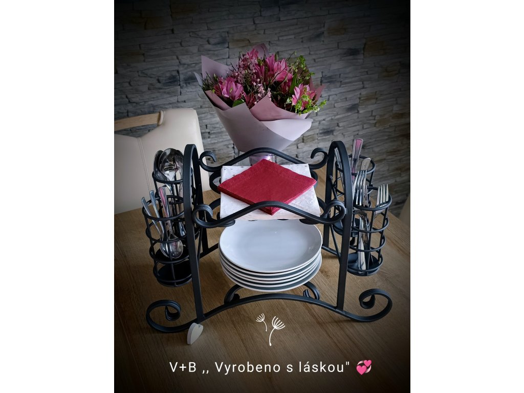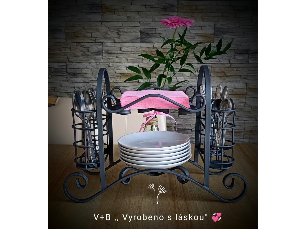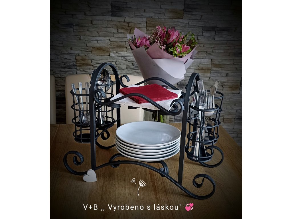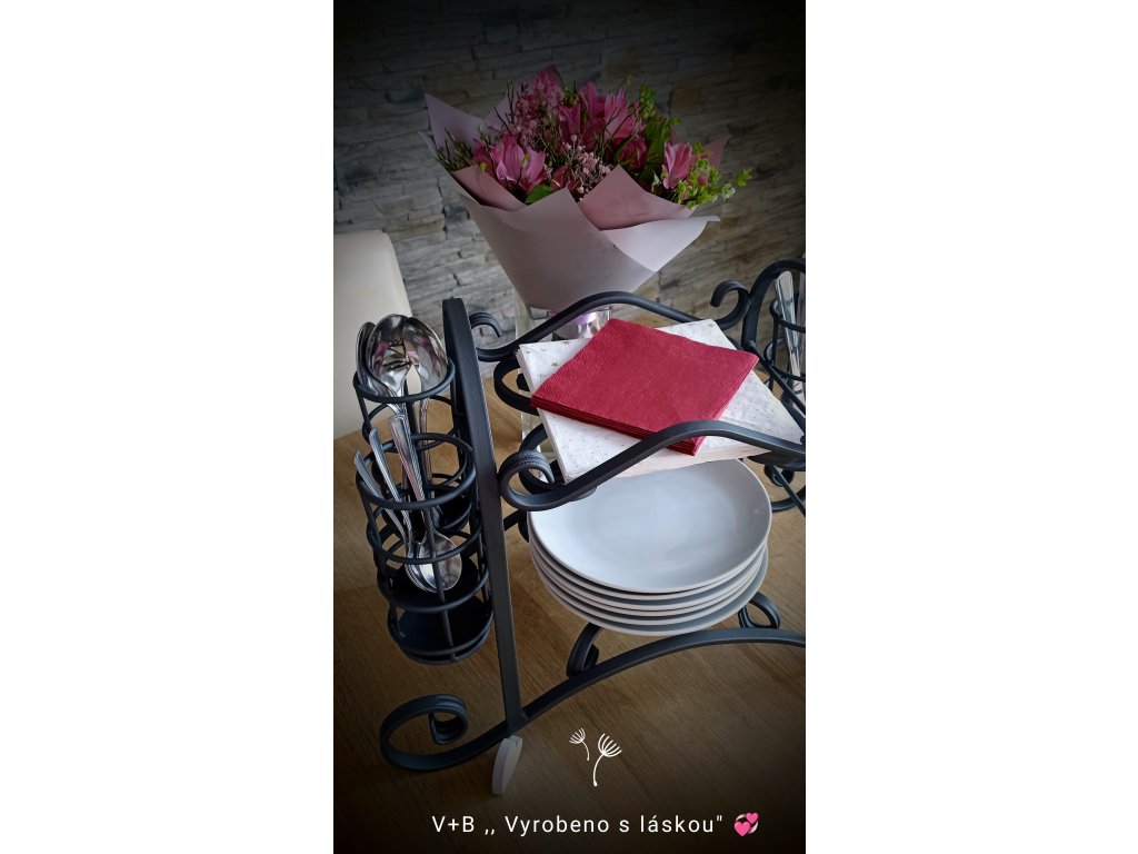 Talířky se do něj vejdou do průměru 22 cm, v horní části prostor pro servírovací ubrousky a do čtyř košíků se vejdou všechny příbory.
