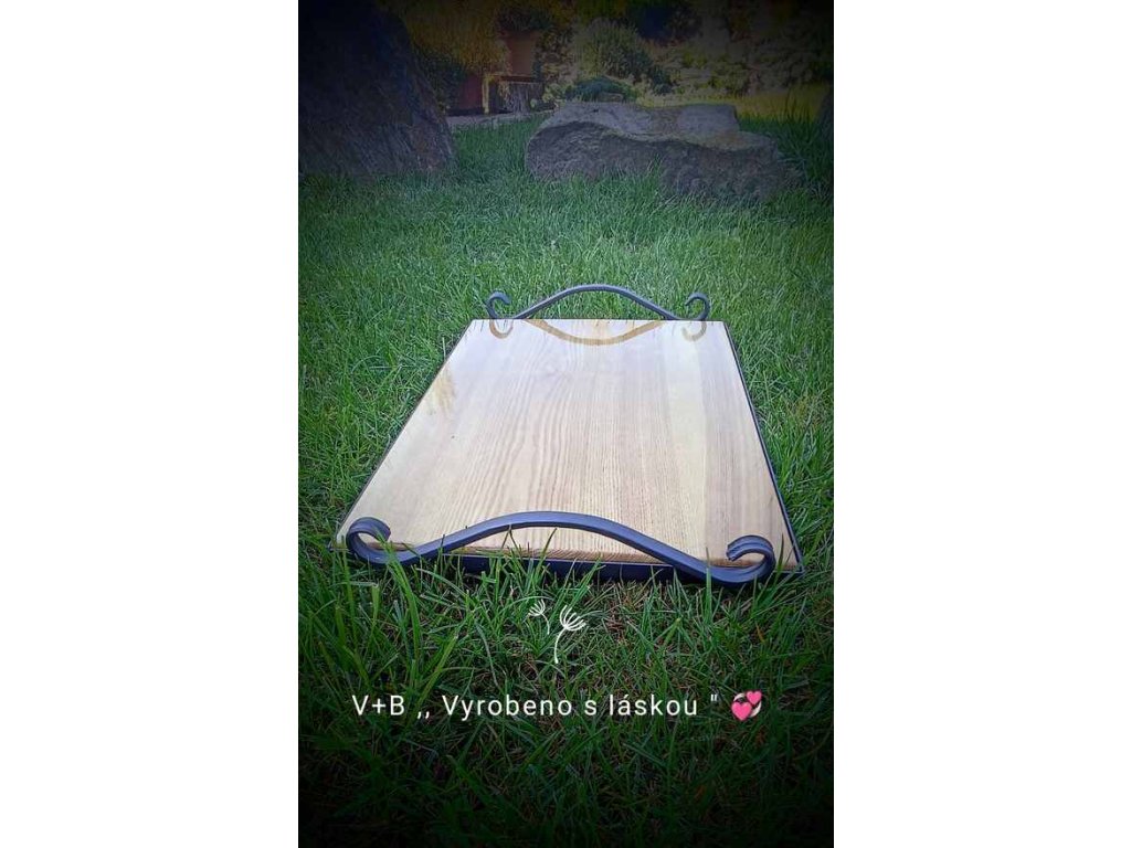 Kovový servírovací podnos s překrásným jasanovým dřevem.