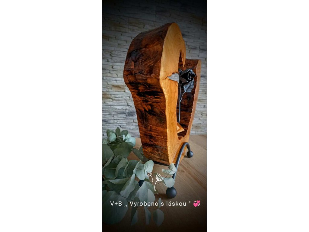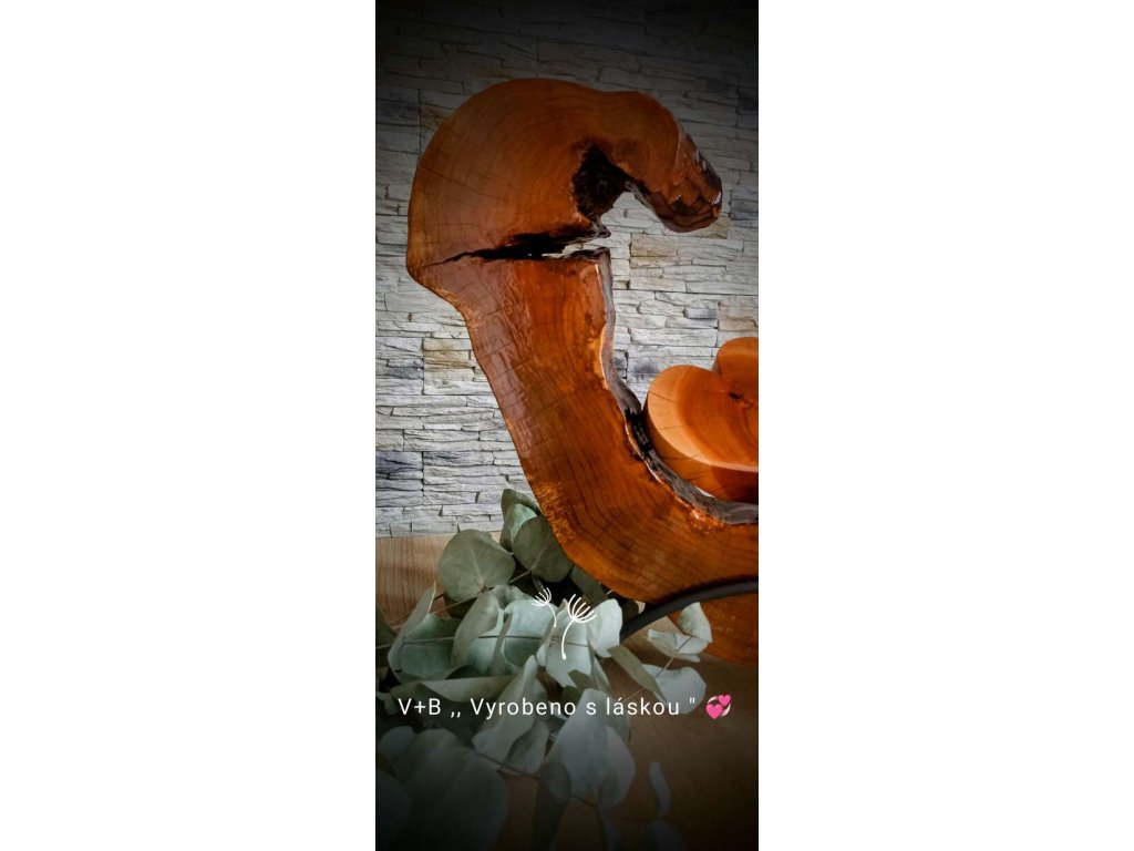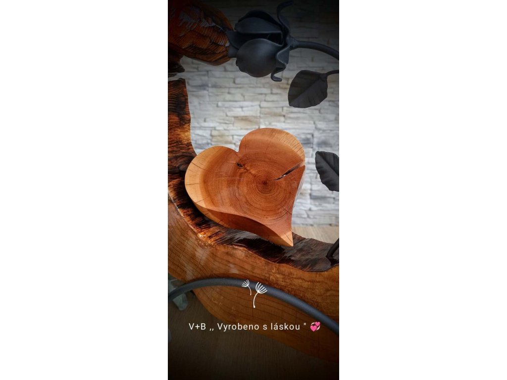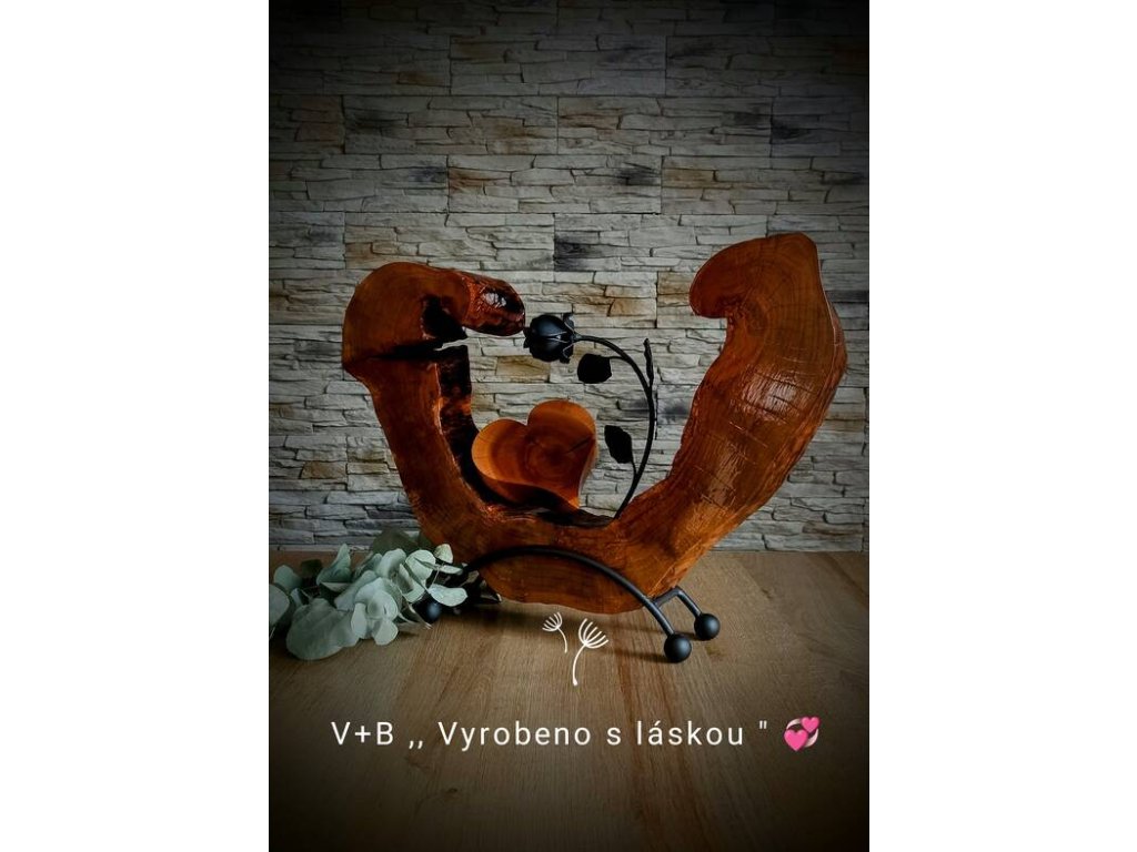Rozměry: výška 37,5 cm, šířka 51 cm, síla dřeva 7,5 cm, kovový podstavec 10 x 29 x 9 cm, srdíčko 15 x 13 x 3,5 cm,