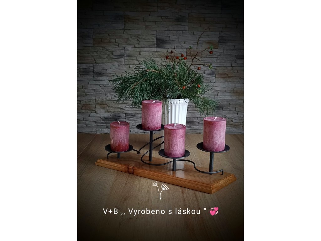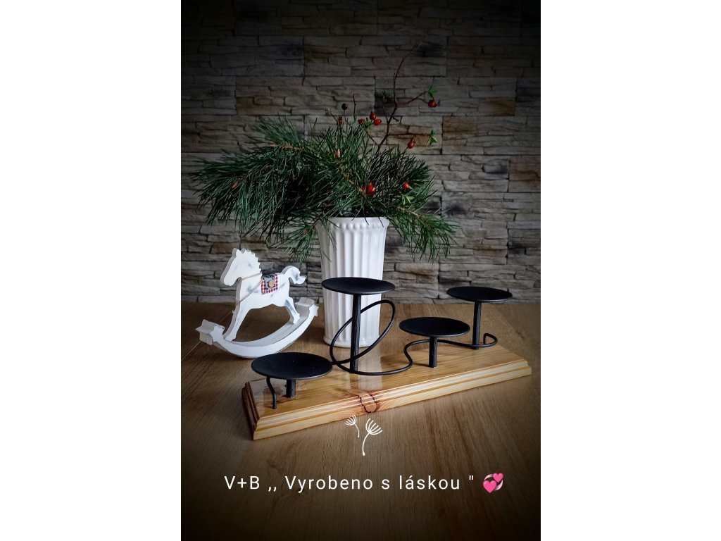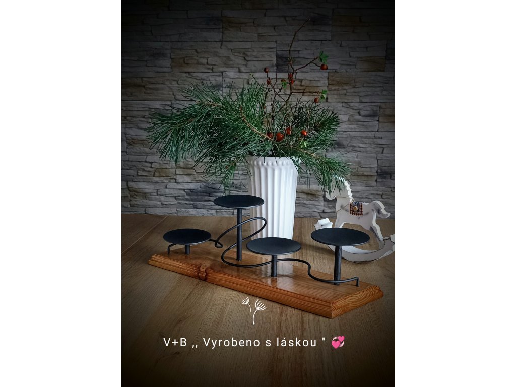 Rozměry: dřevo 39 × 12 cm, výšky ramen 10 – 8 – 13 – 6 cm, průměr misek na svíčku 9 cm