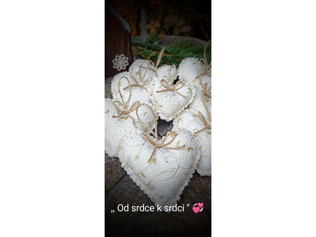 Každé srdíčko je ušito z látky s jemnými zlatými vánočními motivy.