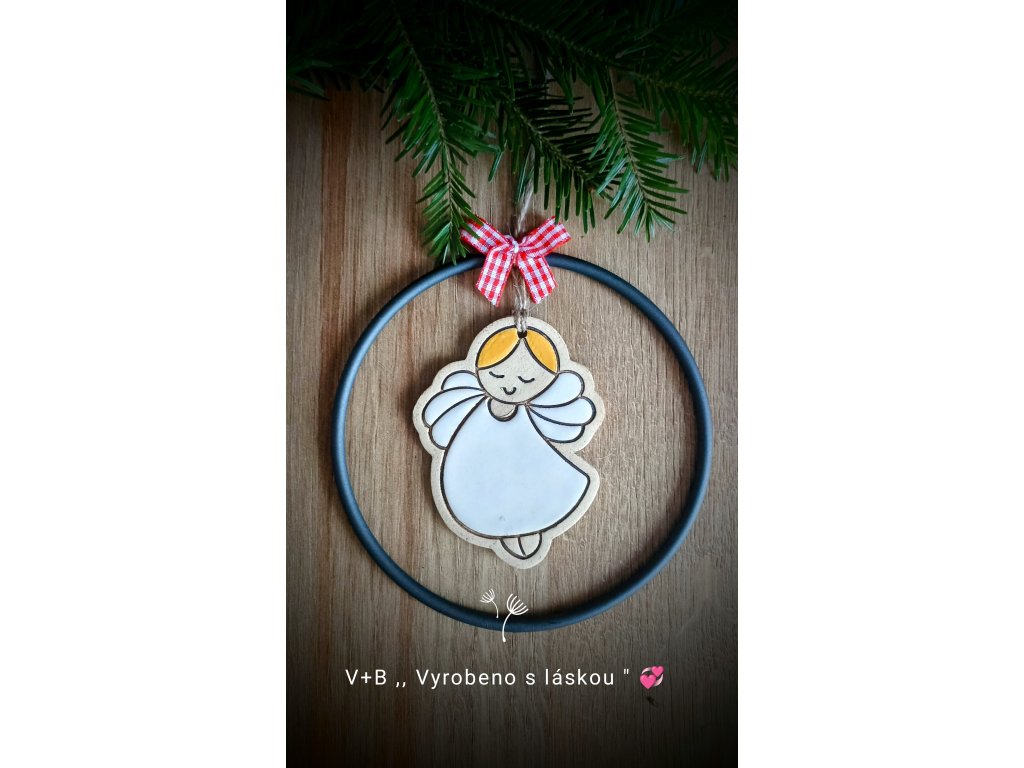 Rozměry: kovový kruh má průměr 13,5 cm, keramická Andělka má 7 x 9 cm