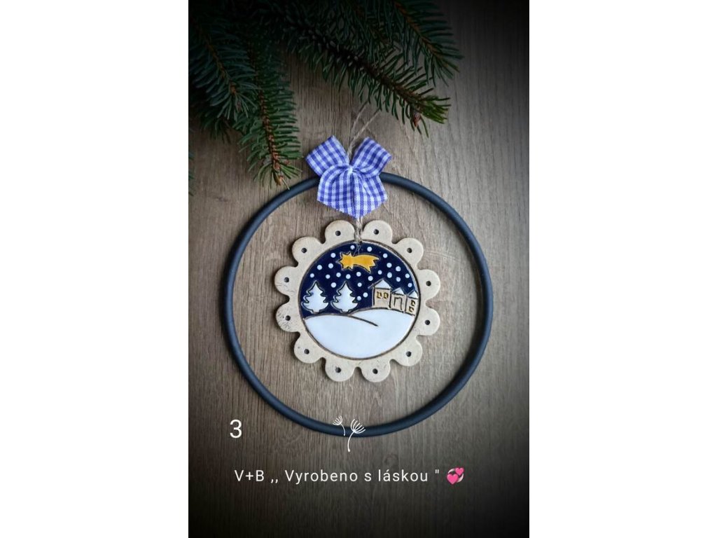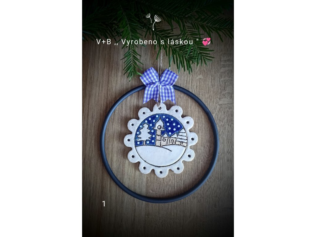 Rozměry: průměr kovového kruhu 14 cm, keramický kostelíček průměr 8 cm