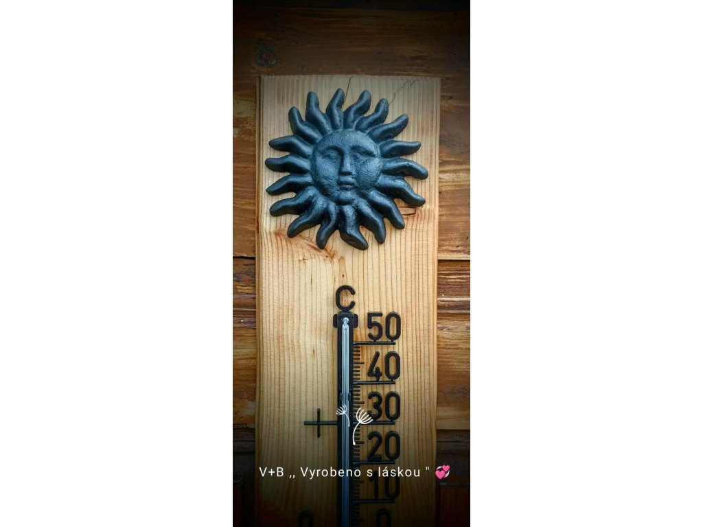 Rozměry: dřevo 53,5 × 14 × 2 cm, sluníčko Ø 12 cm, stupnice 35 cm